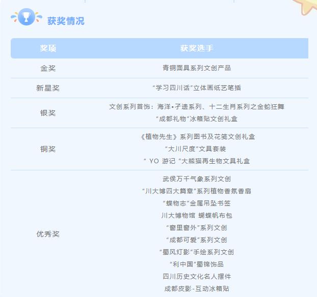 本次大赛成果丰硕,不仅为四川大学博物馆、熊猫邮局、宽窄巷子、成都城市文创IP矩阵平台、四川名人馆等文化空间孵化了一批高品质、可销售的文创商品,独具创意与匠心的文化成果更是献给四川大学130周年华诞的诚挚贺礼。