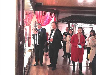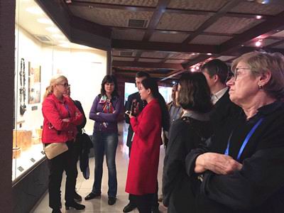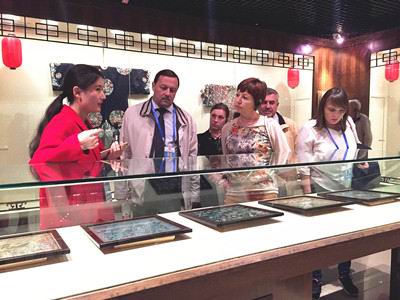 下午2:30,论坛嘉宾中方与俄方校长、专家们一行80余人分成两批陆续进馆,在我馆两位优秀的英语志愿者的带领下,佩戴耳麦全程英语讲解参观。在讲解员生动有趣的逐层各馆细致介绍中,俄方嘉宾对我馆民俗展厅中陈设的中国古代传统习俗、服饰和食寝用具等深感兴趣,不时与讲解员互动交流:二楼少数民族馆中展出的羌族、藏族、彝族等民族宗教用品也引起了俄方学者的浓厚兴趣,并不时驻足听取介绍,嘉宾们在对中外文化的友好讨论交流中结束了一个多小时的参观。