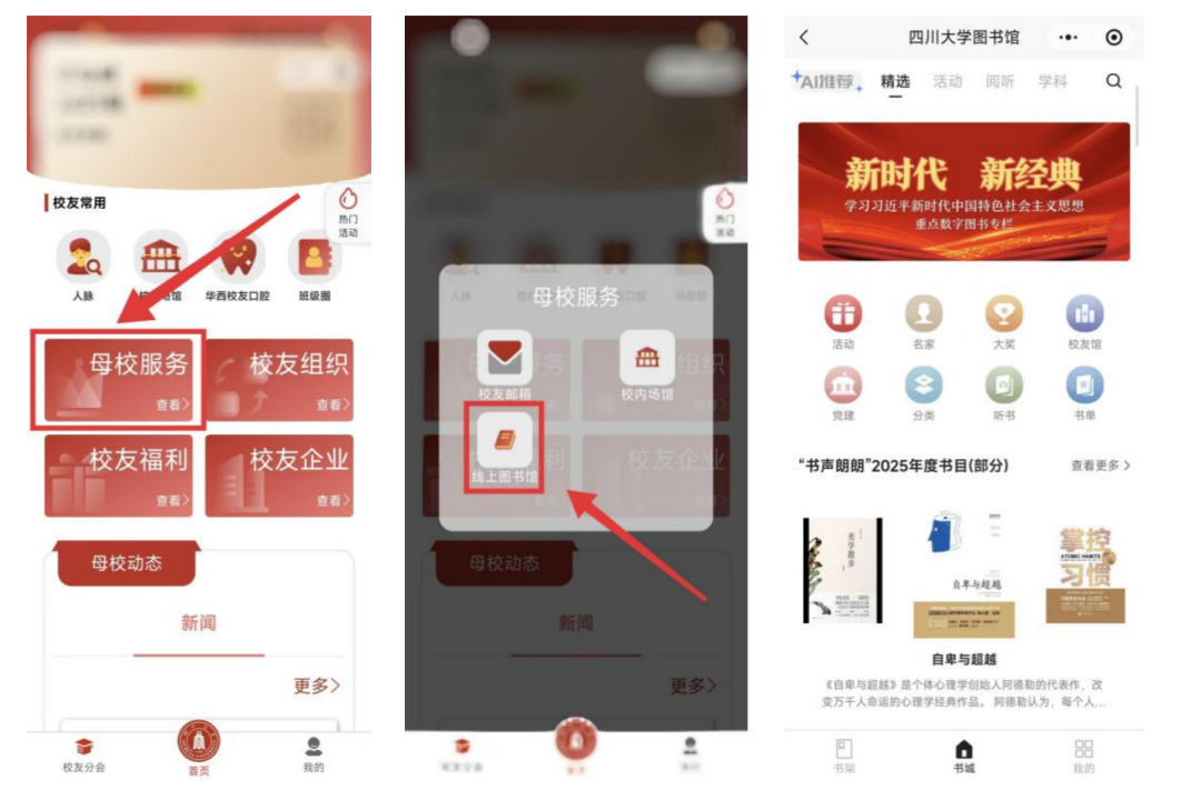 ★ 进入电子校友卡→点击【母校服务】→选择【线上图书馆】,海量电子资源一键解锁!