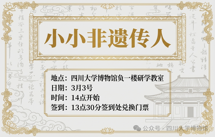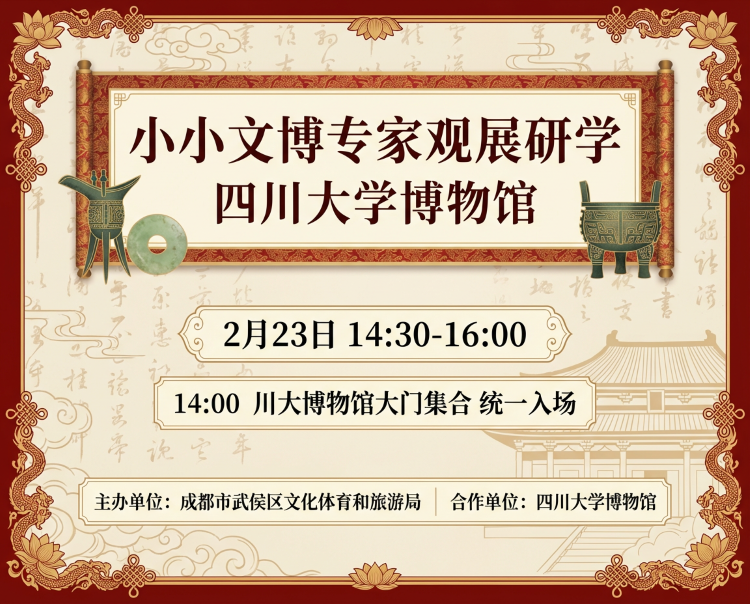第36届武侯闹春之博物馆里过大年新春特别活动博物馆之夜一馆藏奇珍,探秘奇妙夜博物馆之夜招募开启当白日的喧嚣褪去,博物馆的灯光在夜色中温柔亮起,四川大学博物馆不再只是历史的回响,更化身为一座等待探索的奇妙乐园。在这场专为大朋友和小朋友设计的“博物馆之夜”特别冒险中,你可以化身小小冒险家,穿梭于各大展区,寻找目标宝藏、完成打卡;可以与挑灯夜行的古人对话,答题解锁宝藏线索;可以聆听传承千年的古琴雅韵,...