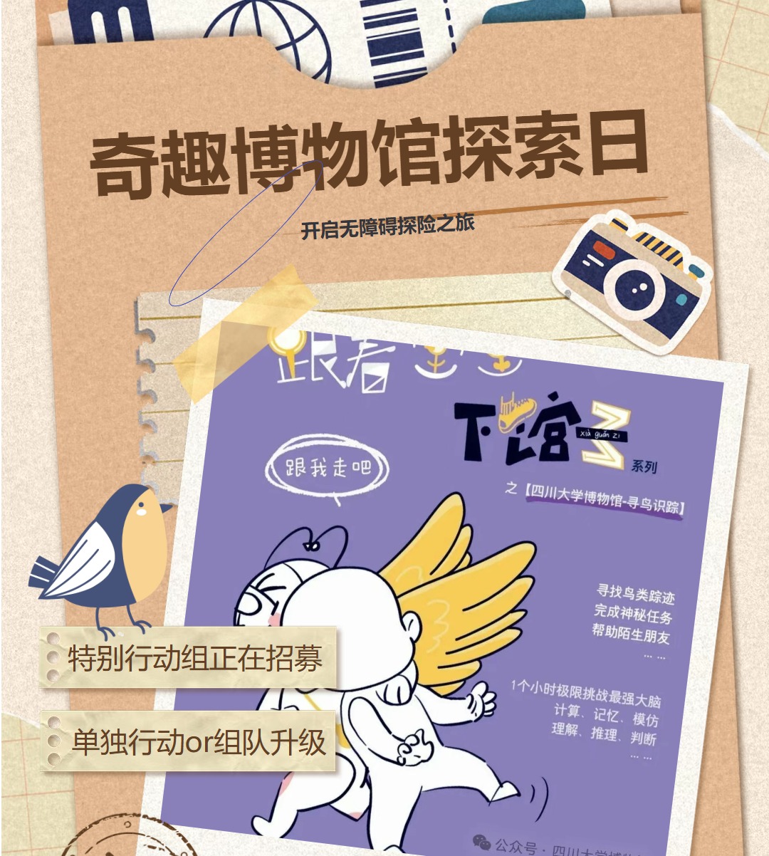 你是否有想过视障人士也能通过自己的方式探索博物馆?斑驳窗格、大红花轿、翩跹皮影指尖循迹、实景互动、现场演绎……用指尖阅读竹编的密语让皮影跃动于手心让我们一起走进那天的川大博物馆看看“陪护出行”的现场4月18日,四川大学博物馆与公益机构“三渡潜能”合作开展视障人士“陪护出行”。活动延续“一对一陪护”模式,每位视障参与者由志愿者全程协助,通过触摸、聆听、互动,多维度体验地道老成都的丰富样貌。这场特别的...