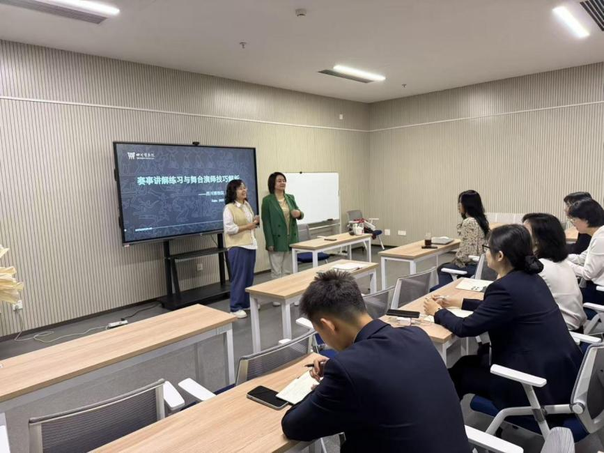 在积极“走出去”的同时,部门也着力将业界专家“请进来”,开展针对性强的内部培训。10月16日上午,特邀四川博物院公众服务部副主任王俐俐到馆,为全体专业讲解员及志愿者讲解员进行专场培训。培训内容紧密围绕讲解大赛的参赛核心需求,涵盖了赛事文件解析、参赛讲解稿的撰写与优化、讲解技巧的精准运用、舞台表现力的有效提升、突发情况的应急处理策略等,并对往届大赛中的优秀案例进行了深入解析。10月17日下午,四川博物院的资深讲解员张馨月到馆为讲解员展开专题培训,通过互动交流进一步巩固和深化了培训内容。
