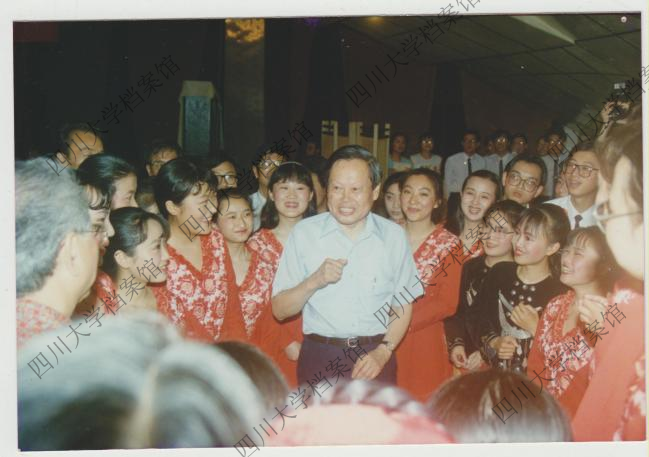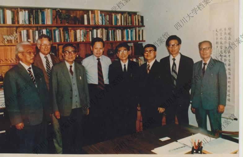 杨振宁与川大代表团合影留念,左四为杨振宁