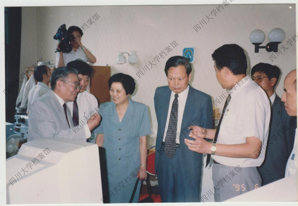 访问期间,杨振宁在校领导陪同下参观了物理实验室。一张彩色照片定格了当时的场景——他专注地观察实验设备,不时与陪同人员交流探讨。他对川大在科学研究方面取得的进展表示赞赏,也对实验室的建设提出了宝贵建议。