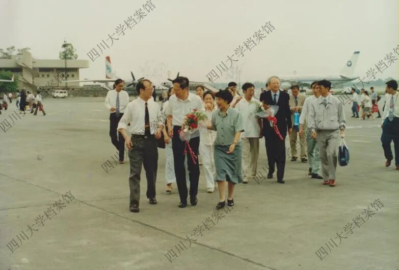 1995年6月3日,四川大学(时为四川联合大学)举行隆重仪式,正式聘请杨振宁先生为名誉教授。照片中,从川大领导到机场的热情迎接,到杨振宁从校党委书记饶用虞手中接过红色聘书,现场气氛庄重而热烈。仪式结束后,学校特别举办了欢迎联欢晚会,学子们激动地簇拥在这位科学大师身旁合影,一张张青春脸庞上洋溢着崇敬与喜悦。