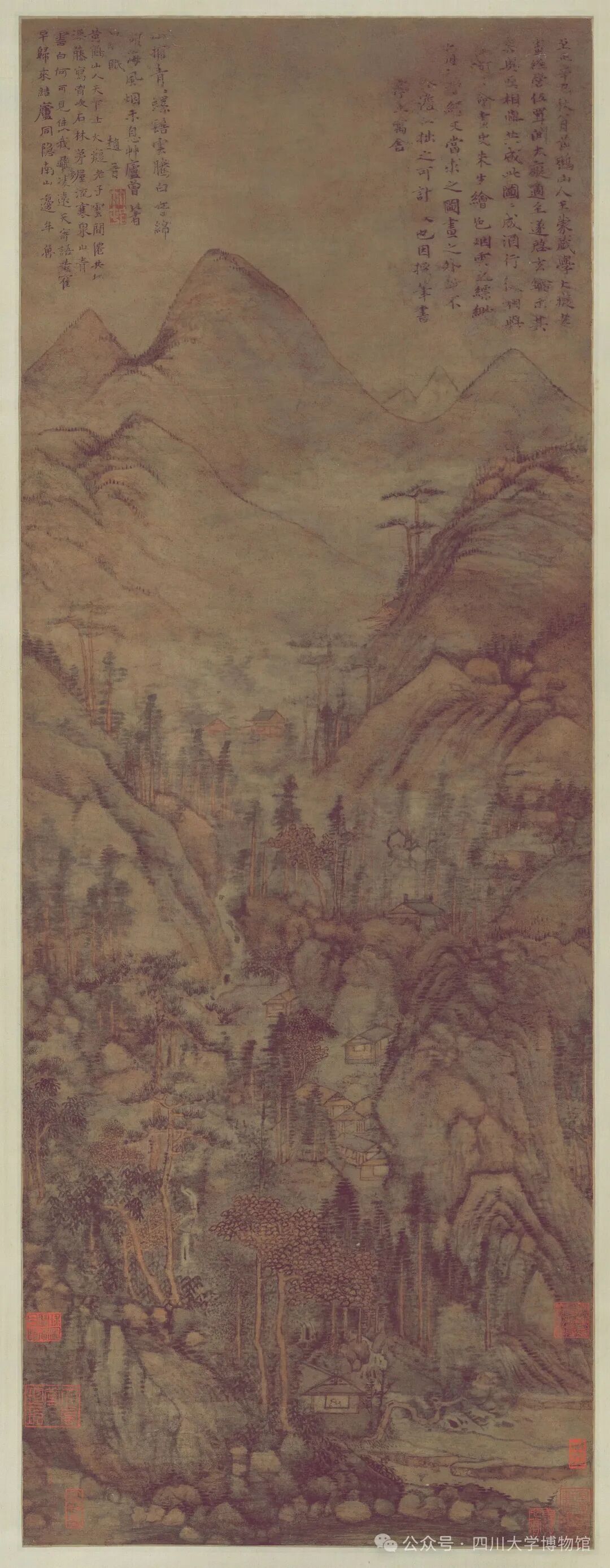 这幅《山水图》现藏于四川大学博物馆。“元四家”之一王蒙,在这幅画上留下了他现存最早的“签名”。题跋中“王蒙戏学大痴老画”八字,道破渊源。“大痴老”即黄公望,为“元四家”之首,王蒙作为晚辈,时常向他请教画艺。1341年时,一场两人未经预演的合作,成为后世追摹的“千古绝唱”。