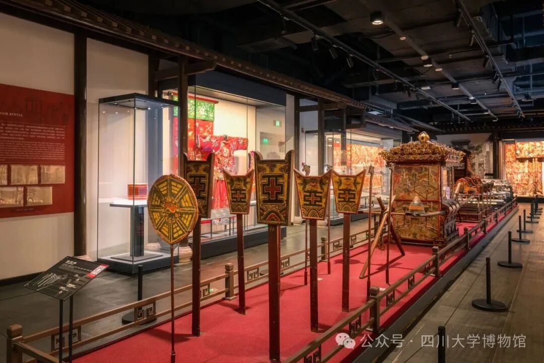 鸿发号,是二十世纪二三十年代成都上草市街一家颇具规模的轿行。这里出租成都人娶亲需要的礼仪物品:开路的仪仗、迎新的花轿、吹打的鼓乐、纳礼的抬盒、房屋各处红彩软缎的装饰,甚至新人的凤冠霞帔、鞋履玉带、珠串盖头,一应俱全,类似于今天的婚庆公司。一顶需八人肩抬的朱漆金箔花轿,堪称清末到民国时期婚嫁文化的“天花板”。轿身通体彩绘、雕镂繁复,融合金漆、螺钿、刺绣等多种工艺,生动再现了近代民间富庶家庭的生活图景。时光流转,在百年之后的川大博物馆,这些婚俗用具依旧鲜活、生动,说着往昔的百姓事,漾着相同的中国红。