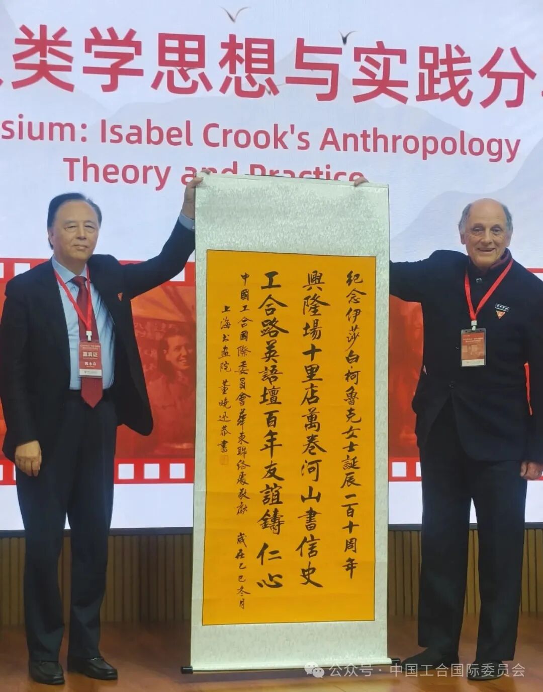 会议期间,中国工合国际委员会华东联络处向伊莎白顾问亲属赠送了特别创作的对联:“兴隆场 十里店 万卷河山书信史;工合路 英语坛 百年友谊铸仁心”,凝练概括了其不朽功绩与精神境界。