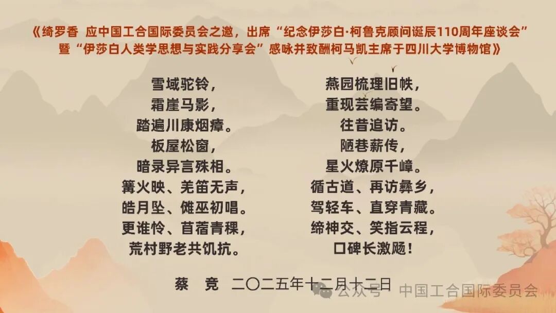蔡竞顾问为座谈会填词《绮罗香 应中国工合国际委员会之邀,出席“纪念伊莎白·柯鲁克顾问诞辰110周年座谈会”暨“伊莎白人类学思想与实践分享会”感咏并致酬柯马凯主席于四川大学博物馆》。