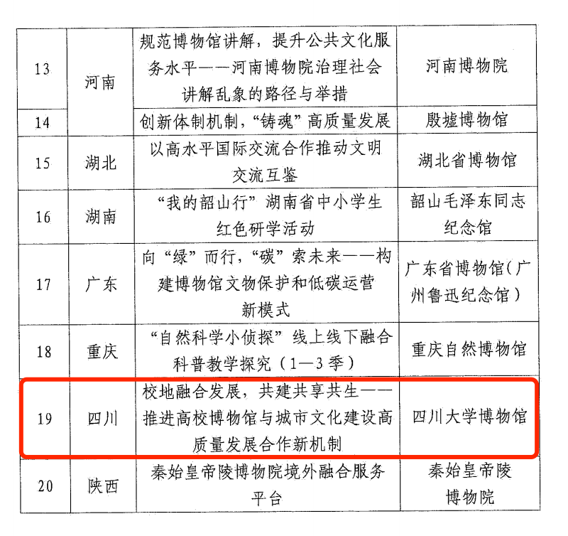 央广网成都12月17日消息(记者 唐诗敏 王颖)12月15日,国家文物局公布2025年全国博物馆改革发展案例推介名单,四川大学博物馆(以下简称“川大博物馆”)以“校地融合发展,共建共享共生——推进高校博物馆与城市文化建设高质量发展合作新机制”创新方案(以下简称“川大-成都”案例),跻身全国20项推介案例。