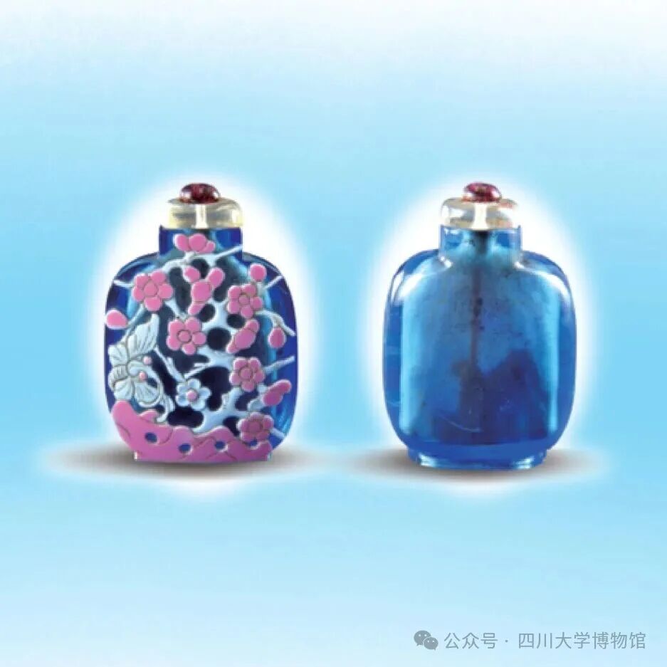 蓝地套红白双色玻璃梅花图鼻烟壶 清